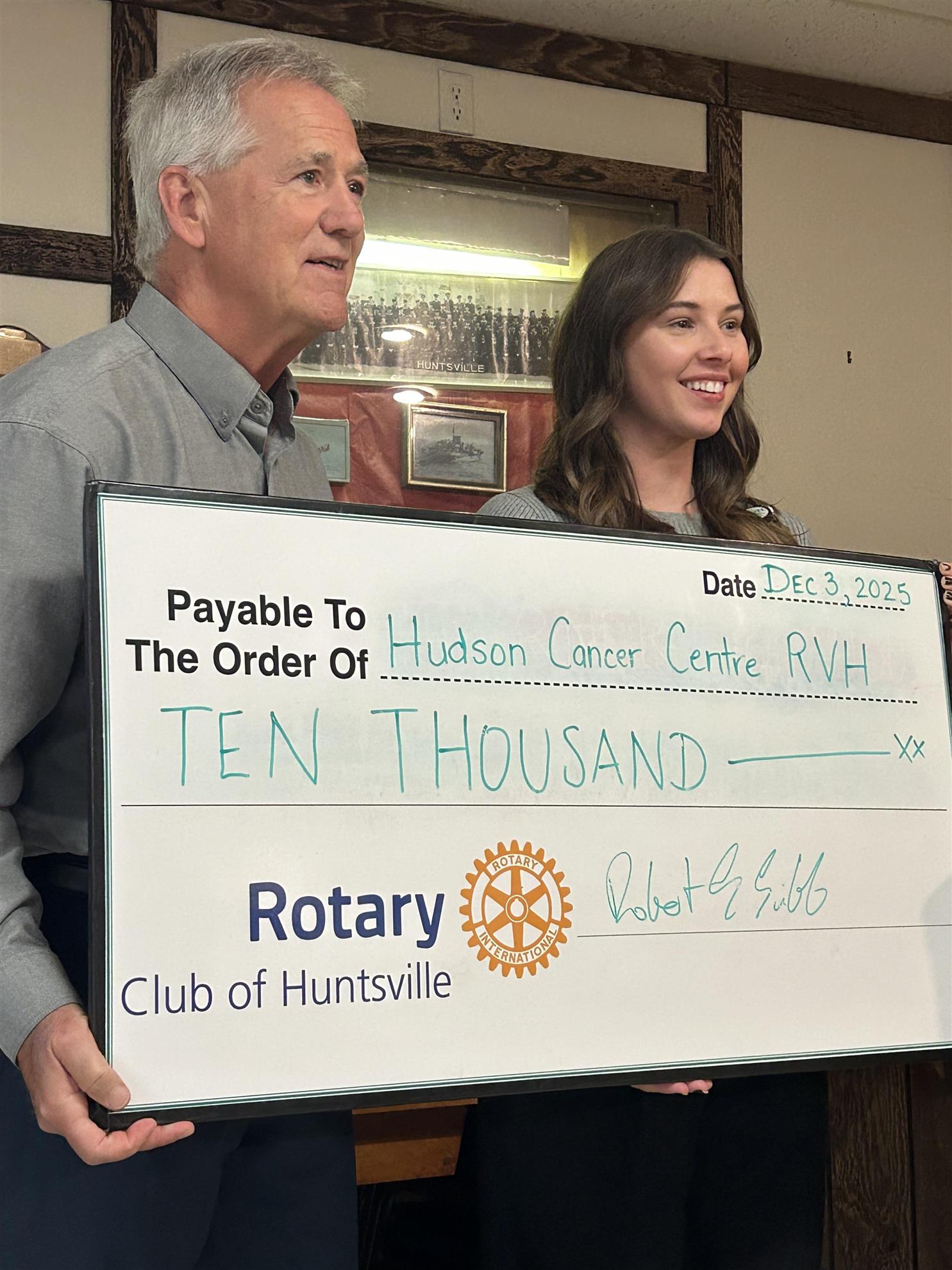 On April 2nd 2025 the Rotary Club of Huntsville presented the Huntsville Hospital Foundation with a cheque for $10,000 as part of our 10 year $100,000 pledge. Since 1988 our Club has donated $370,000 to the Hospital Foundation to help equip our Hospital.